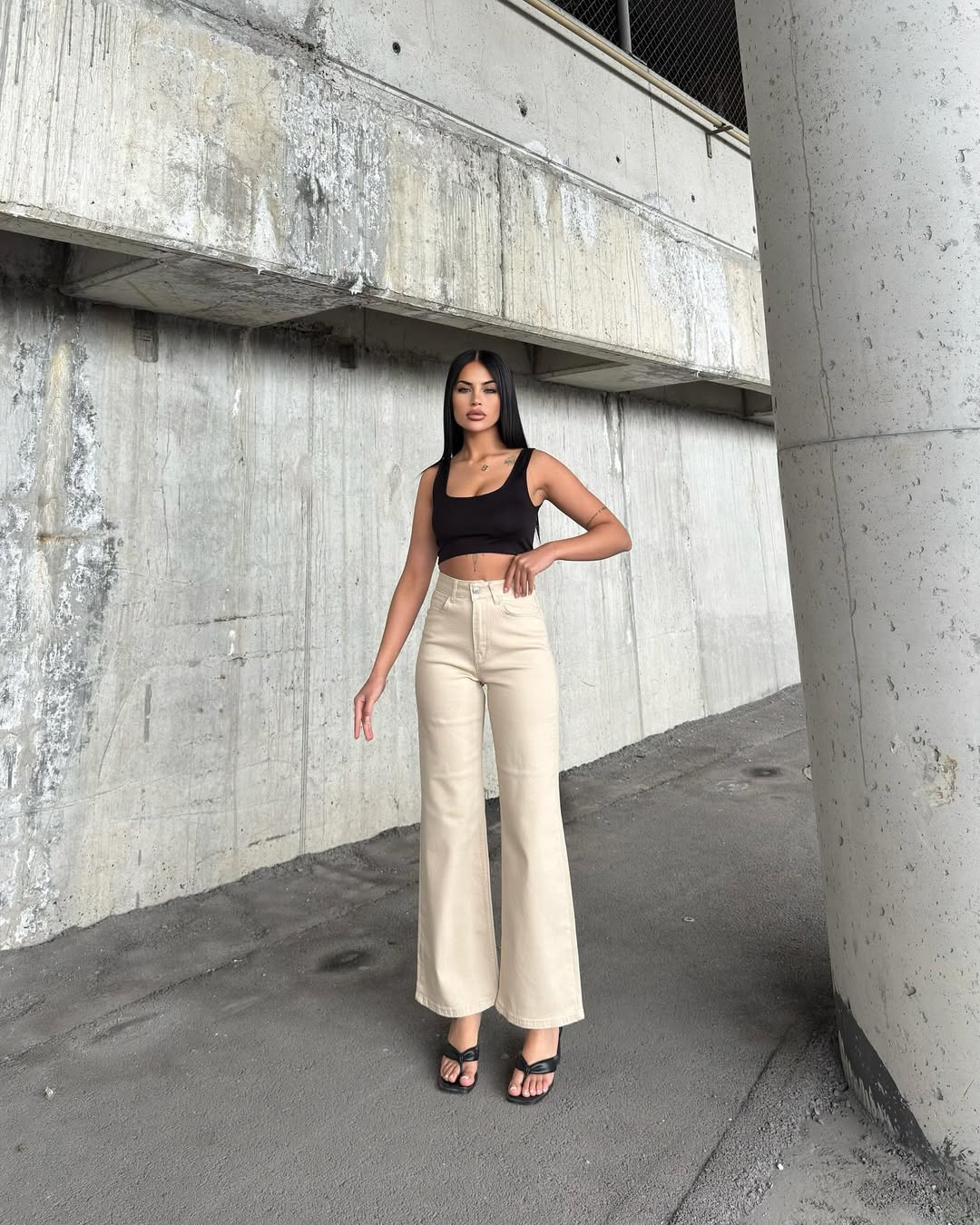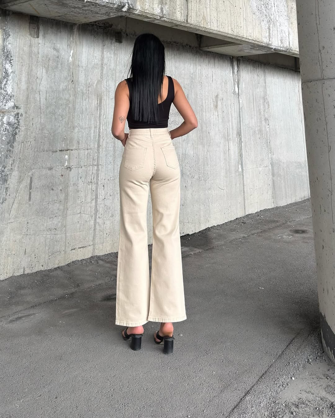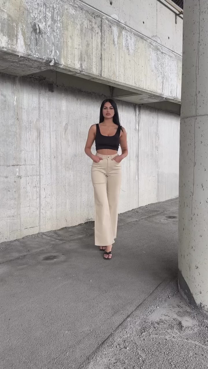 Beige high-waisted jeans feature a sophisticated wide-leg silhouette that creates a streamlined, elongated profile. The neutral, sand-colored denim offers a clean and polished look, accented by a classic button-and-zip fly and traditional five-pocket styling. Designed with a structured fit through the hips that transitions into a generous, straight-cut leg, these versatile trousers provide a modern, minimalist aesthetic that easily bridges the gap between casual daywear and elevated evening style.