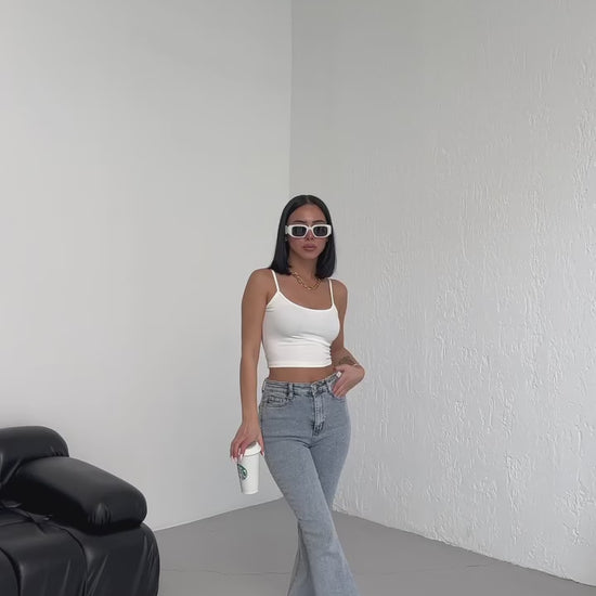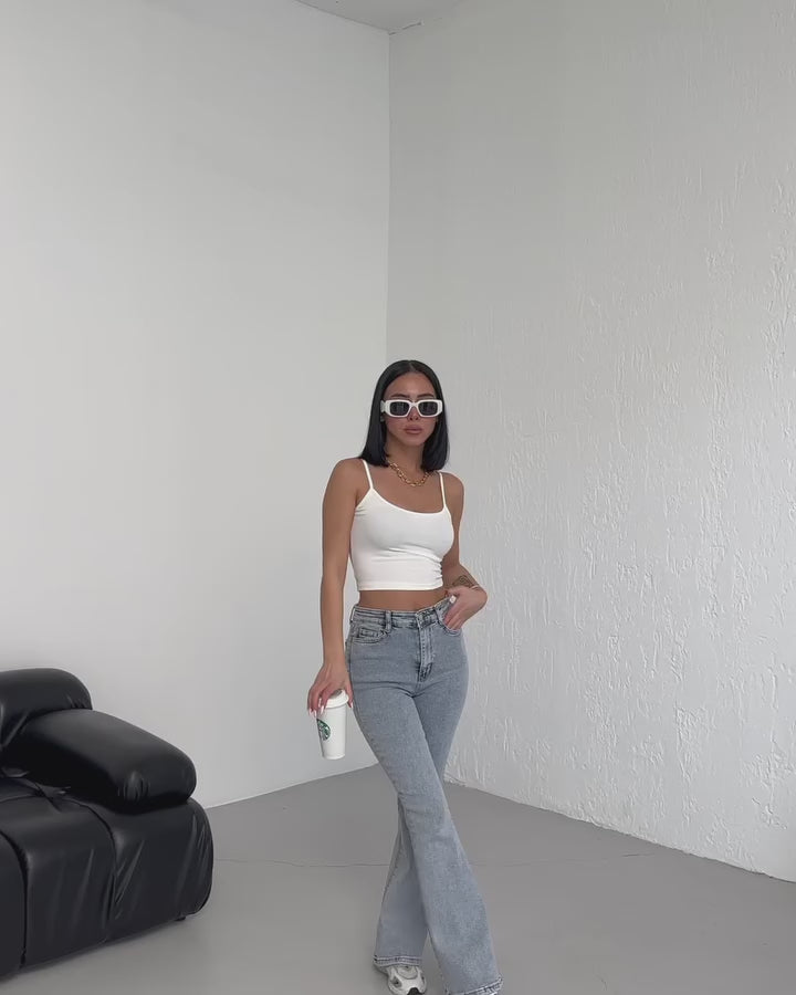 light-wash denim jeans feature a classic high-waisted rise and a flattering flare-leg silhouette that fits snugly through the hips and thighs before widening at the hem. The "acid wash" finish gives them a vintage, retro-inspired look, while the clean waistband and standard five-pocket design maintain a modern edge. They are styled for a casual, effortless aesthetic, paired here with chunky white sneakers and a cropped tank top to emphasize the elongated leg line.